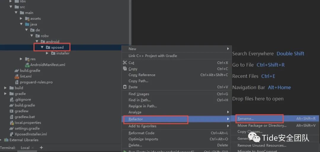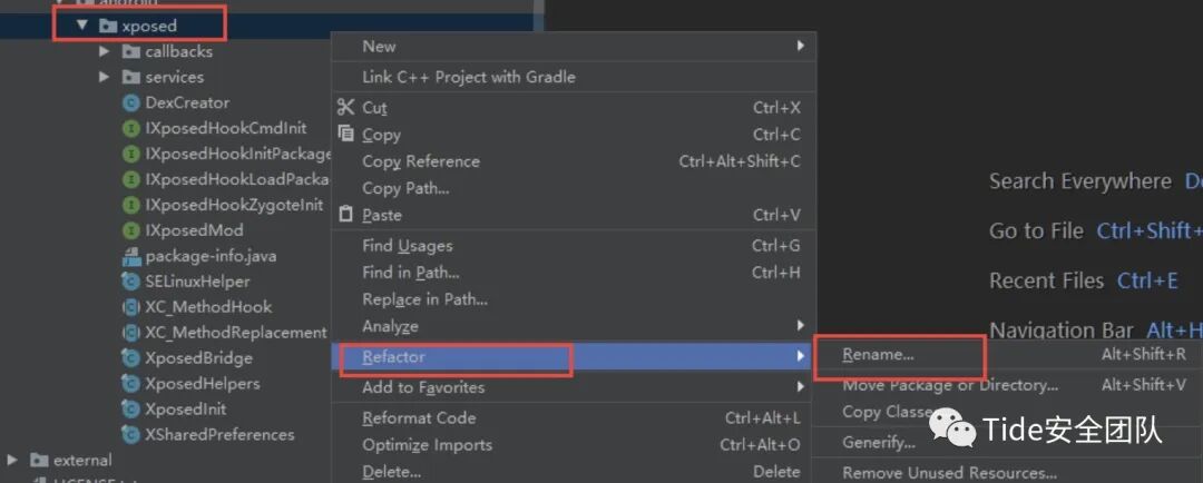 在包名路径中,将xposed改成xppsed,这样可以保证包名长度是一样,同时xposed特征消失不见,选择Refactor→Rename