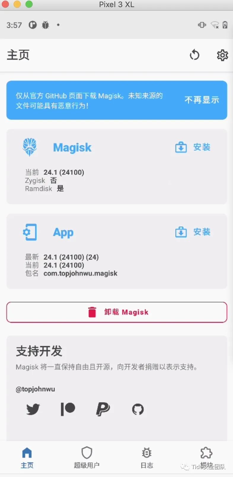 重启发现已成功安装Magisk(脸谱Logo图标)。