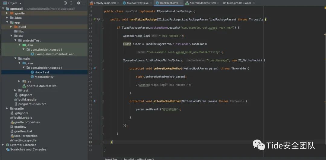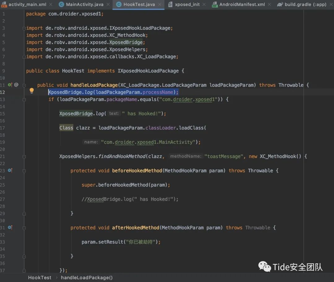 public class HookTest implements IXposedHookLoadPackage {public void handleLoadPackage(XC_LoadPackage.LoadPackageParam loadPackageParam) throws Throwable {if (loadPackageParam.packageName.equals("com.droider.xposed1")) {XposedBridge.log(" has Hooked!");Class clazz = loadPackageParam.classLoader.loadClass("com.droider.xposed1.MainActivity");XposedHelpers.findAndHookMethod(clazz, "toastMessage", new XC_MethodHook() {protected void beforeHookedMethod(MethodHookParam param) throws Throwable {super.beforeHookedMethod(param);//XposedBridge.log(" has Hooked!");}protected void afterHookedMethod(MethodHookParam param) throws Throwable {param.setResult("你已被劫持");}});}}}