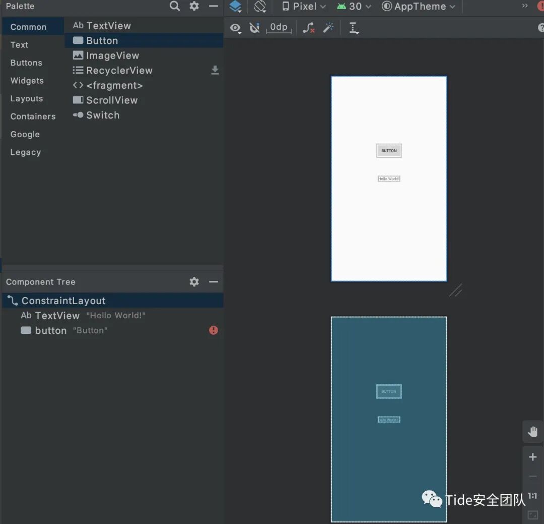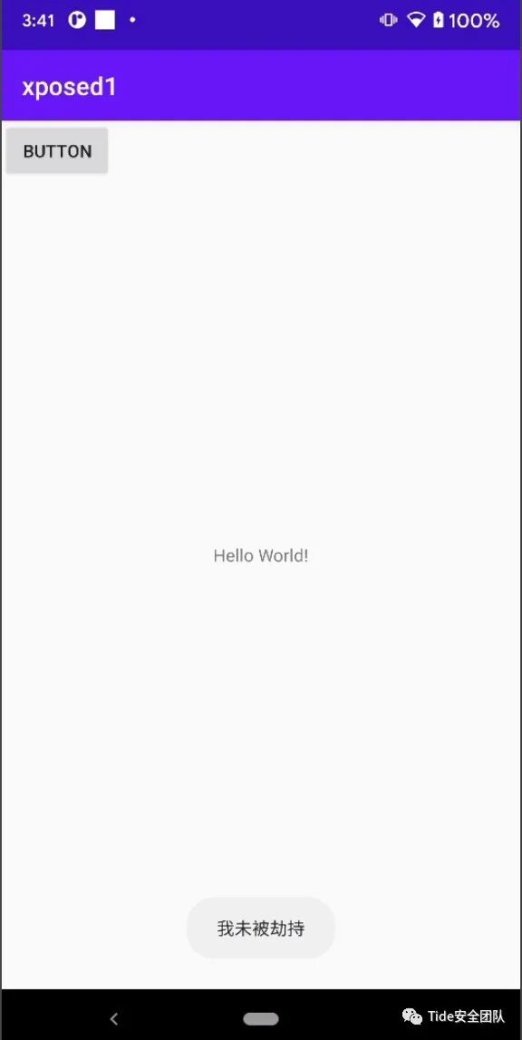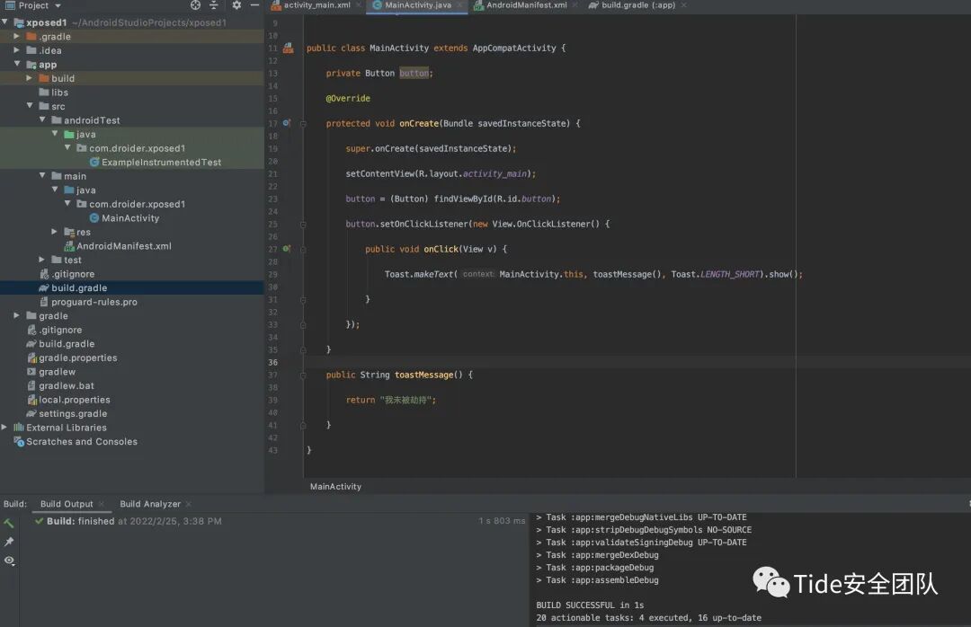 然后简单编写一下逻辑。MainActivity界面有个按钮,点击按钮后会弹出一个toast提示,该提示的内容由toastMessage()方法提供,而toastMessage()的返回值为“我未被劫持”: