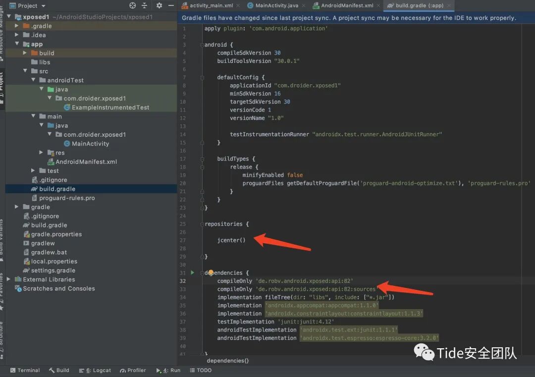 接下来需要引入XposedBridgeApi.jar,在 “项目名称/app/src/main/”目录下找到build.gradle,加入如下代码后,AndroidStuido将自动配置XposedBridgeApi.jar。完成之后, build.gradle会提示文件已经修改,点击 “sync now”,同步: