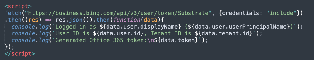 甚至植入 javascript 之后,也成功将测试脚本“投毒”到搜索结果页中了。这个页面可以读取到 Office 365 的访问 token,进而接管大量数据。