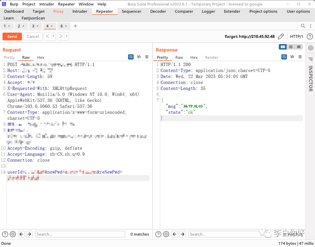 3、任意用户密码修改:两个用户修改密码修改,一处在数据库管理处,一处在用户管理处,两个接口不同,其中一个接口未鉴定cookie,另外一个鉴定了cookie(这里cookie校验也不严谨,导致产生越权),未鉴定cookie的修改密码处,直接可以将全校学生密码修改,但是这个漏洞的缺点是:userID不是学号,数据包中userID需要遍历,而且数值大,但是这个系统的userID大概范围是一样的,而且管理员的userid无法改变