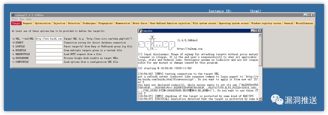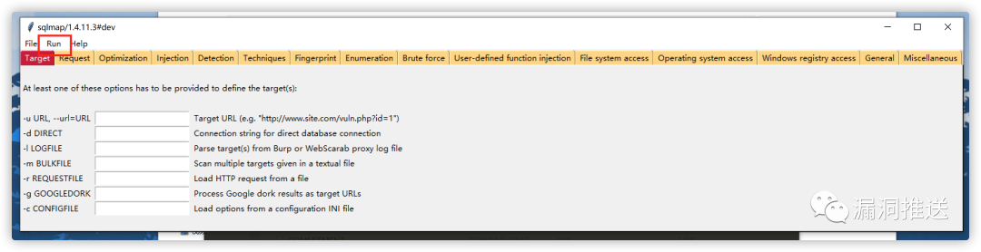 今天看sqlmap源码的时候,发现了一个sqlmap隐藏的参数使用--gui即可启动GUI填好各种参数以后,点run就行了但是这个功能,兼容性不是很好,Windows10容易卡死。我测试再Window