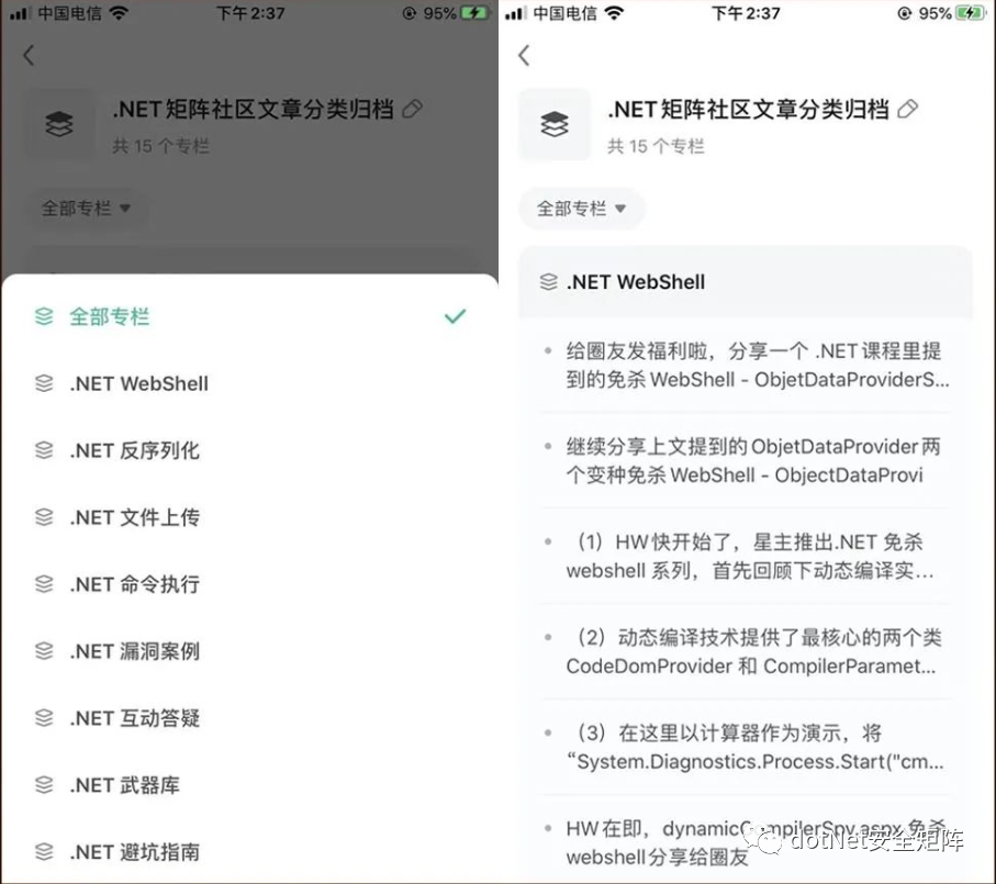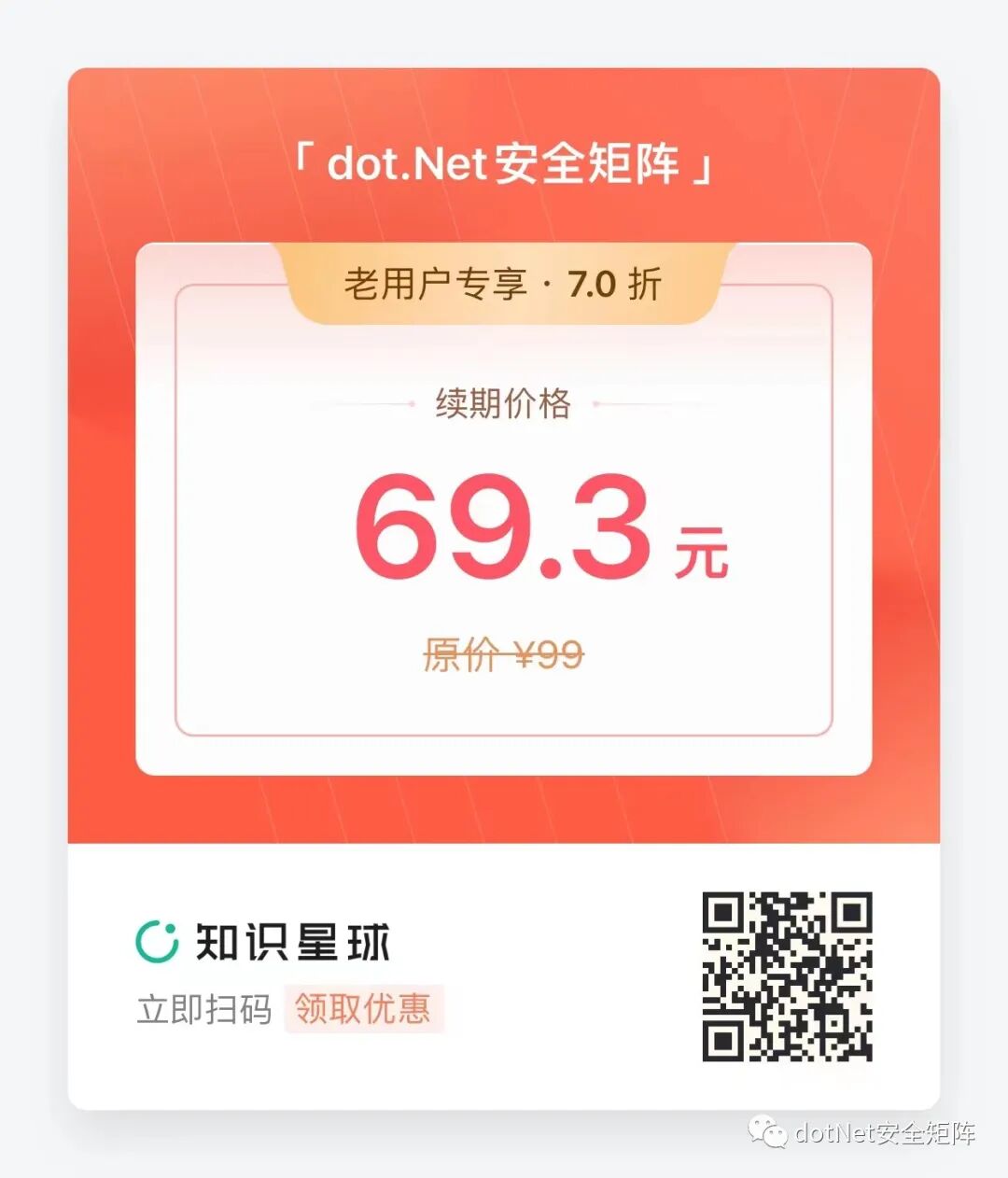 [ dotNet安全矩阵 ]知识星球运营的第一创立知识星球的目的本来就是分享和讨论技术,同好者聚在一起,内部商讨技术的氛围一直非常好,同好者一起强大。所以不追求利益最大化,只追求是不是志同道合。愿意续费的,大家是好朋友,我们会继续在星球里各种分享自己的经验技术;续费在原价99元的基础上再打7.0折,约等于70元即可续费星球