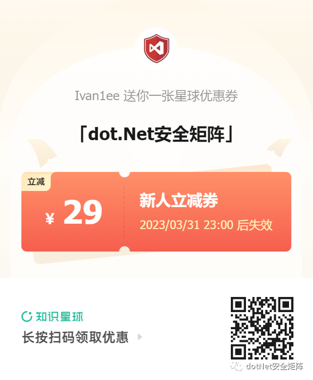 另外随着加入的星友们越来越多,问题也越来越变得多样化,因此星主压力也越来越大,为了保证内容质量的同时,会适当提高门槛,如果你还在犹豫要不要加入星球的话,可以扫码领取优惠卷加入我们,以优惠价加入肯定不亏,期待感兴趣的师傅们加入!