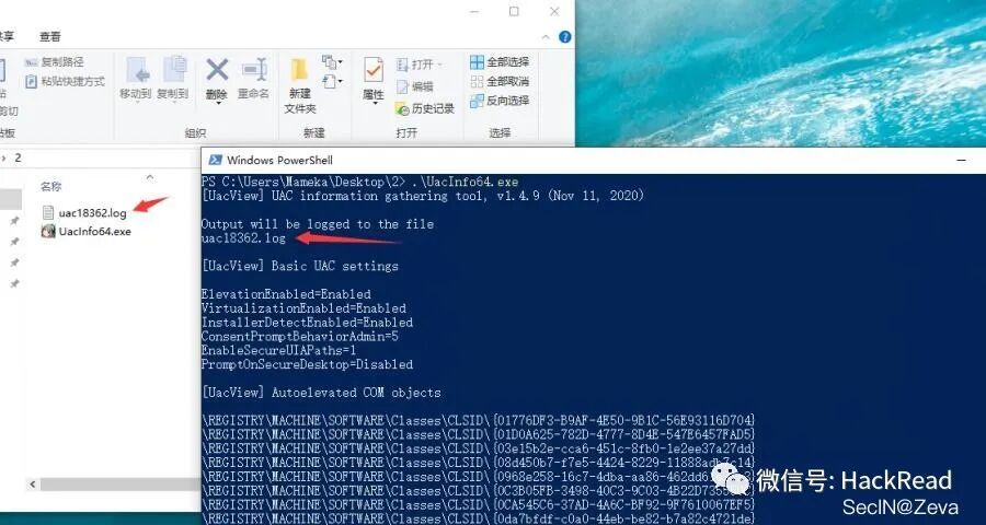 会生成一个UacInfo64.exe,可以快速查看系统的UAC设定信息以及所有可以利用的程序和COM组件,会在同一目录下生成一个log文件记录所有输出结果。
