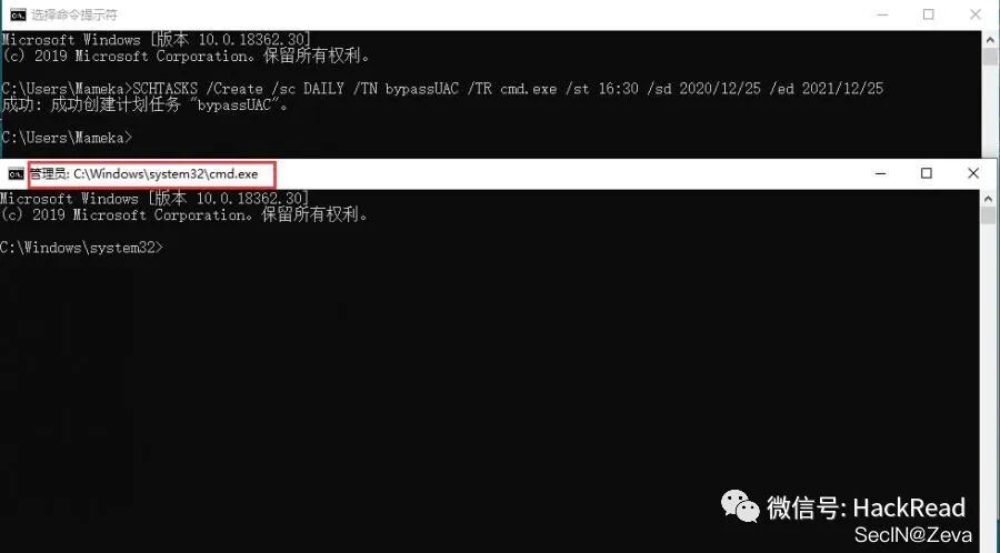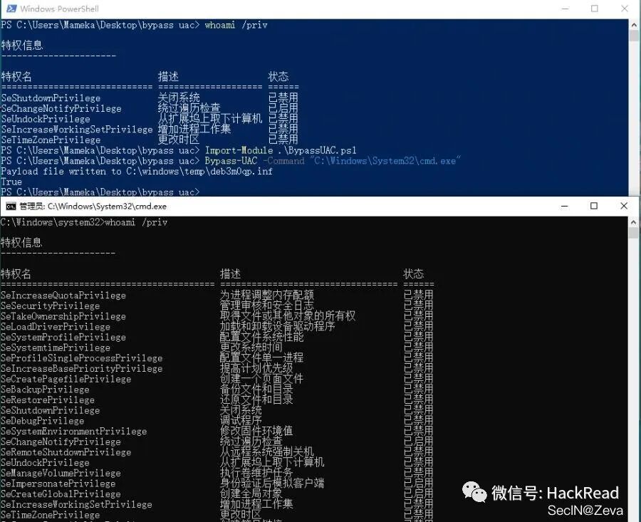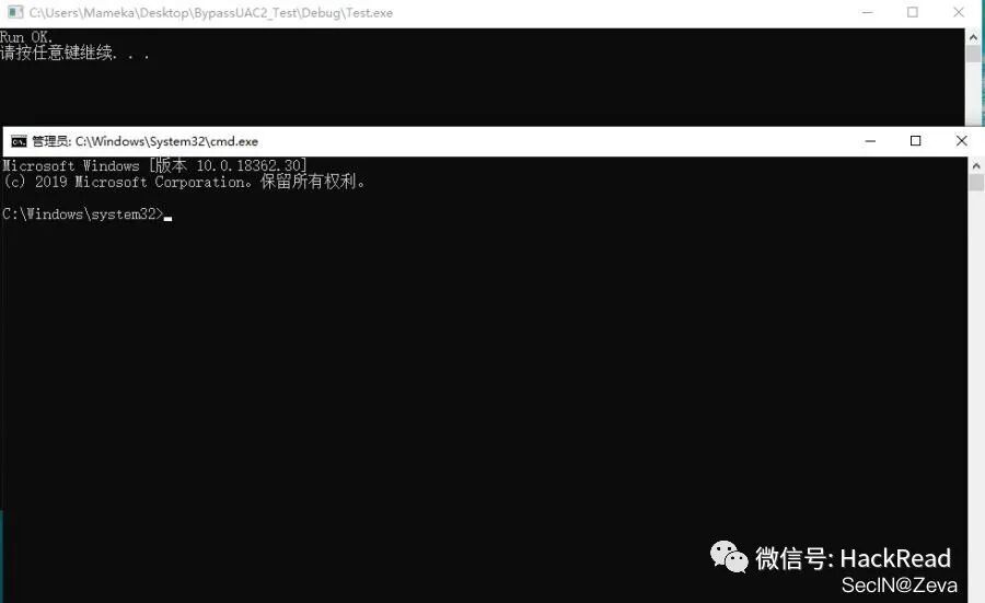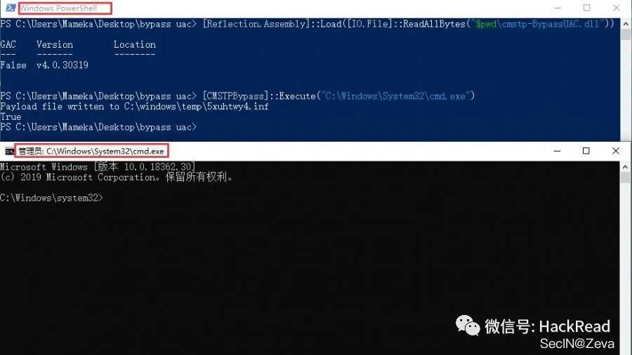 执行上面的代码,即可创建并激活提升权限的COM类。ICMLuaUtil接口通过上述方法创建后,直接调用ShellExec方法创建指定进程,完成Bypass UAC的操作。