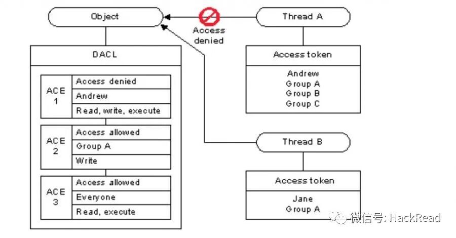 如果安全描述符中不存在DACL,则系统会允许线程进行访问。如果存在DACL,系统会顺序遍历DACL中的每个ACE,检查ACE中的SID在线程的AccessTkoen中是否存在。以访问者中的User SID或Group SID作为关键字查询被访问对象中的DACL。顺序:先查询类型为DENY的ACE,若命中且权限符合则访问拒绝;未命中再在ALLOWED类型的ACE中查询,若命中且类型符合则可以访问;如果前两步后还没命中那么访问拒绝