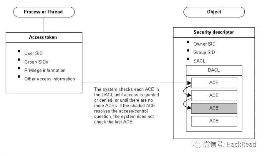 DACL定义了对象的访问策略,允许还是拒绝。DACL中的ACE定义了哪些用户,哪些用户组对该对象有怎样的访问权限,当访问该对象的时候系统会检查这个SID和DACL中的ACE进行匹配、对比,然后找到ACE,看允许还是拒绝,如果该对象没有设置DACL,系统会默认允许,如果设置了,但是没有ACE会默认拒绝