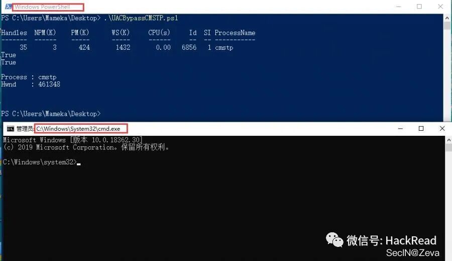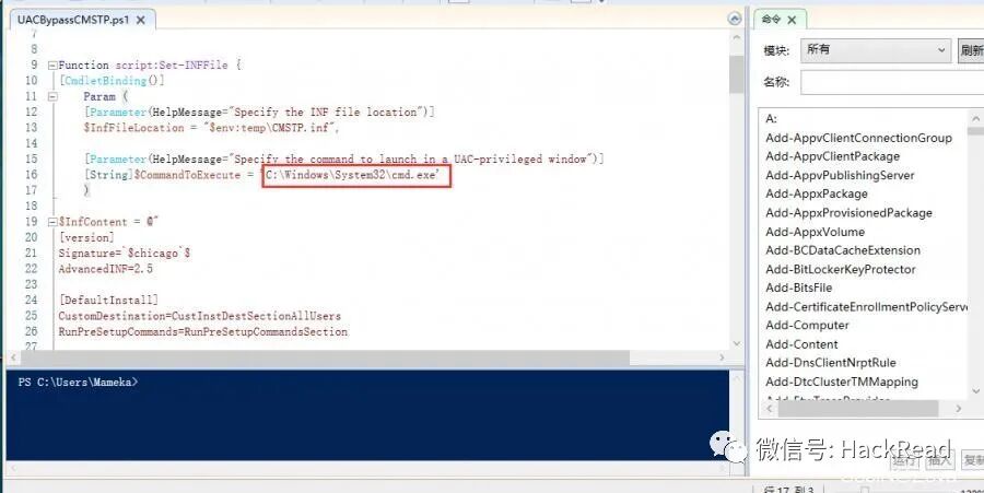 给出脚本链接:https://gist.github.com/tylerapplebaum/ae8cb38ed8314518d95b2e32a6f0d3f1#file-uacbypasscmstp-ps1,我们需要修改代码中第16行为C:\Windows\System32\cmd.exe,然后运行UACBypassCMSTP.ps1,得到管理员权限的cmd窗口。