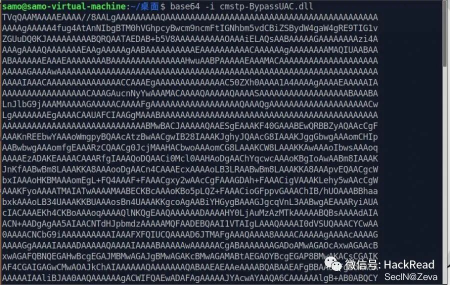 先把我们生成的dll文件进行base64编码,这里我直接使用ubuntu进行的 base64 -i cmstp-BypassUAC.dll