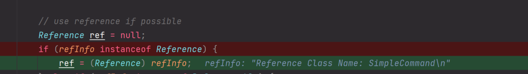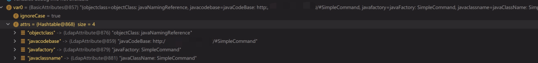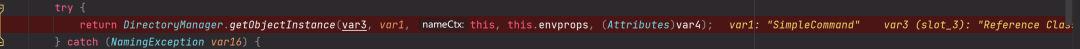 首先判断是否包含必有属性javaClassName,必须得有这个,没有直接返回,再把javaClassName存入var3,此处值为javaClassName: SimpleCommand,再看看有没有javaFactory,这个是可选,假如有就存入var4,此处是包含的值为javaFactory: SimpleCommand,接着便根据javaClassName,javaFactory和codebase值建立一个Reference。接着判断javaReferenceAddress是否为null,此处属性不含这个,因此跳过。直接返回建立的引用Reference