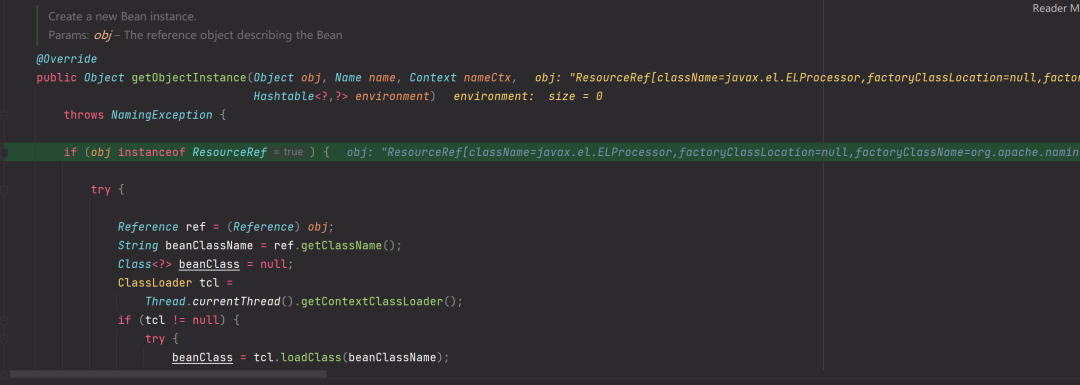 org.apache.naming.factory.BeanFactory 在 getObjectInstance()中会通过反射的方式实例化Reference所指向的任意Bean Class,并且会调用setter方法为所有的属性赋值。而该BeanClass的类名、属性、属性值,全都来自于Reference对象,均是攻击者可控的。