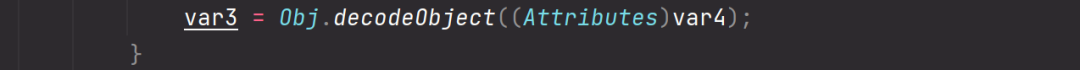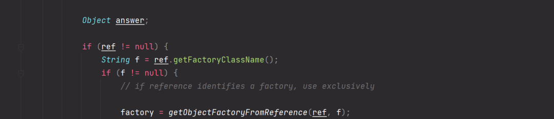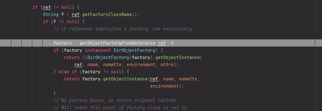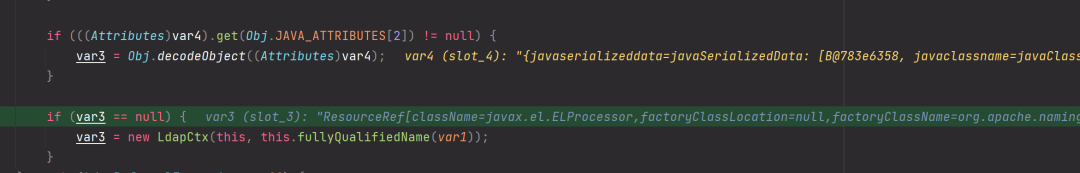 取出objectClass存入var1,也就是objectClass: javaNamingReference,此处不为null,进入判断是否包含javaNamingReference,大小写都判断一下是否存在,此处显然存在,因此会进入decodeReference()方法,此处传入两个参数,一个是整个attribute,另一个则是最先拿到的codebase var2