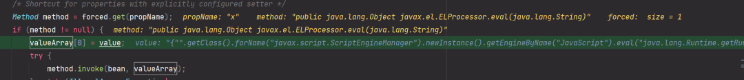 这个情况下,目标BeanClass必须有一个无参构造方法,有public的setter方法且参数为一个String类型。事实上,这些setter不一定需要是set..开头的方法,根据org.apache.naming.factory.BeanFactory中的逻辑,我们可以把某个方法强制指定为setter。这里,我们找到了javax.el.ELProcessor可以作为目标Class。