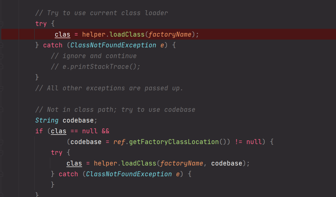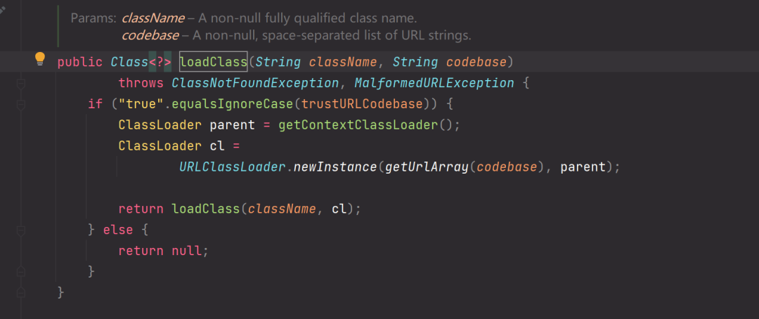 先尝试本地加载,否则用codebase加载。最终因为加载我们的远程恶意类,再静态方法区嵌入恶意代码,实例化过程中被执行