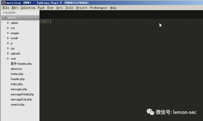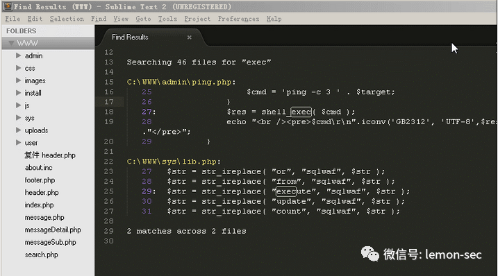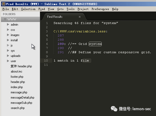 我们对函数名进行搜索,右键点击www目录,在弹出来的菜单上选择find in folder,这个是查找整个文件夹的意思,然后我们在下方弹出的框内输入第一个敏感函数:system,点击Find,这时,编辑器就会查找WWW目录下所有内容里面有system的文件。