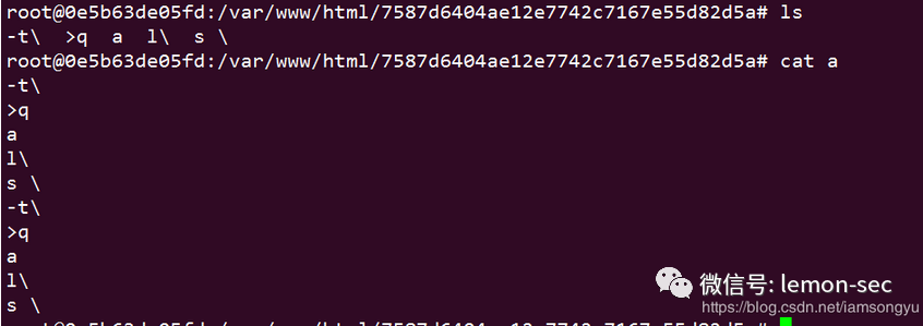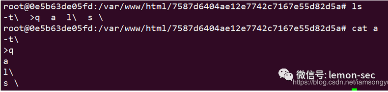 -t\>qa //这之前的命令虽然是错的,但不会影响l\s \-t\>q //实际输出的命令为 ls -t>q