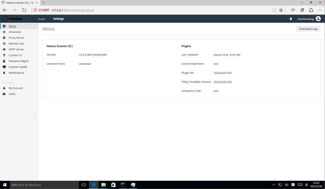 以下步骤强烈建议在windows虚拟机中配置 且保持nessus默认安装目录 先使用Nessus-x64.msi安装 安装好后浏览器打开https://127.0.0.1:8834 按照常规安装方法先走完步骤,进入到正常web页面 这里不再赘述步骤(百度上一堆) 然后回到文件夹下管理员执行crack_mht.bat 过程较长,等待完成后 再次打开web界面https://127.0.0.1:8834 登陆进去后右上角会有一长串英文提示 意思是插件正在编译 等待编译完成就好了