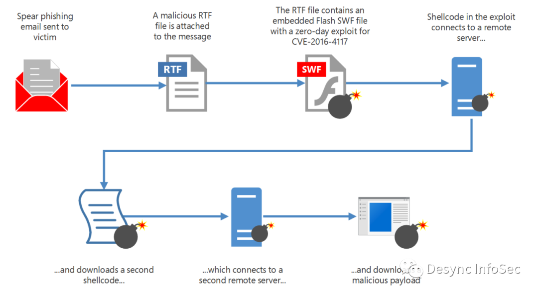 而NEODYMIUM使用的恶意软件为Wingbird,通过向目标用户发送带有恶意RTF文件的钓鱼邮件获取目标用户的系统权限。RTF文件中包含嵌入式的SMF Flash用于触发CVE-2016-4117漏洞。
