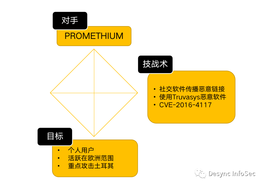 微软发现PROMETHIUM和NEODYMIUM使用不同的技战术和攻击工具。PROMETHIUM通过社交软件传播恶意软件Truvasys以获取目标用户的系统权限。PROMETHIUM诱导用户访问恶意URL,用户访问后会触发0day漏洞:Adoble Flash插件漏洞CVE-2016-4117。
