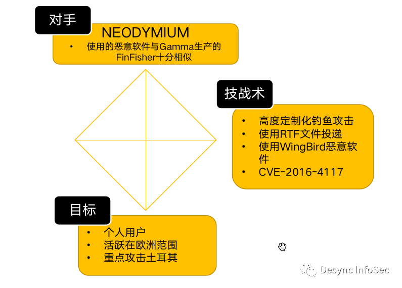 PROMETHIUM和NEODYMIUM是从2012年开始活跃的两个独立的APT组织,他们只针对个人用户进行攻击。这两个组织所使用的技巧有所不同,但在0day漏洞利用方面有很强的联系。