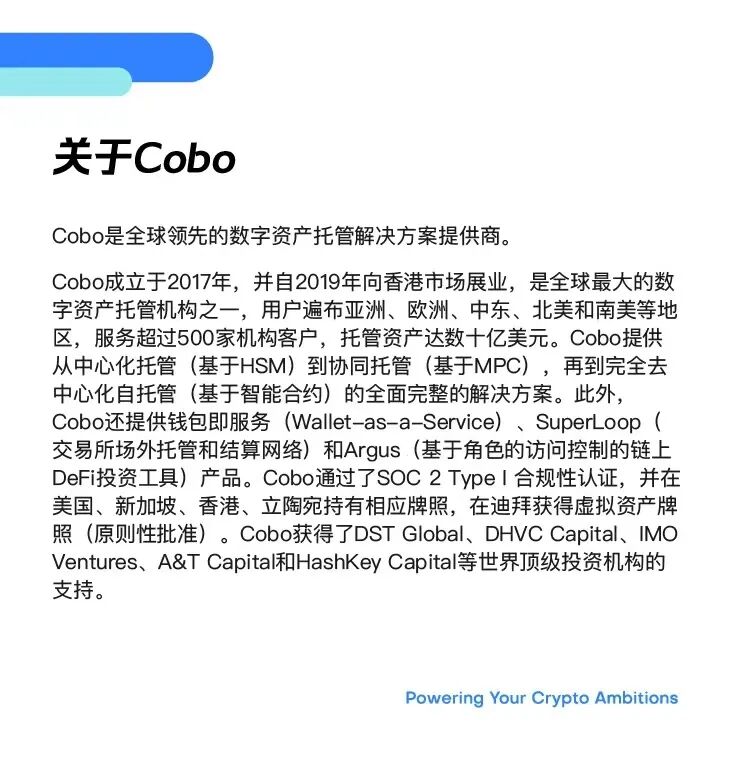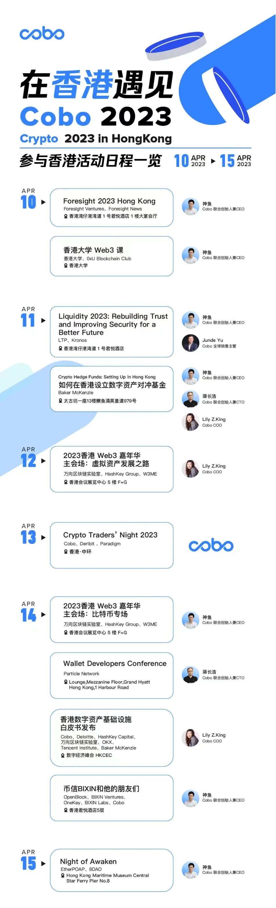 作为全球领先的数字资产托管方案提供商,Cobo 团队也将在创始人神鱼、蒋长浩带领下,出席多项活动,期待与各位伙伴和客户在香港相见。