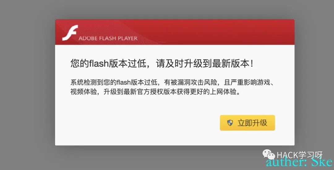 https://github.com/r00tSe7en/Flash-Pop效果:当有人第一次访问时,会触发下图的弹框,诱导访问者点击立即升级,这时候会跳转到我们的Flash木马地址自动下载。当访问者点击安装了木马后,就会上线到远控端。然后将访问者的浏览器设置一个cookies,避免访问者刷新后又弹框。这样就不会触发访问者的警觉了,误以为安装了Flash后就可以了。