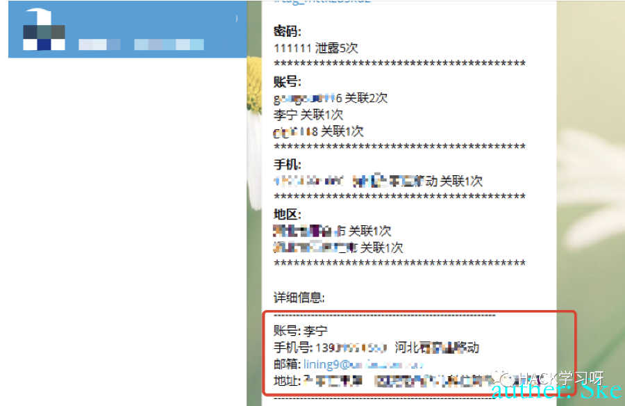 从收集到的邮箱中中选择了lining9用户的邮箱,在tg中找到了该邮箱泄露的信息,我们应该关注的重点信息是手机号