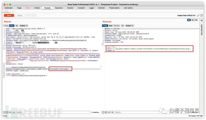 因为有这里有layui的前端限制,还不能直接传php文件,用bp抓个包修改一下后缀名就行。
