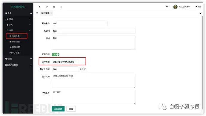 如果能进后台,后面的事情就非常简单。在系统->设置->网站设置中可以修改上传文件限制: