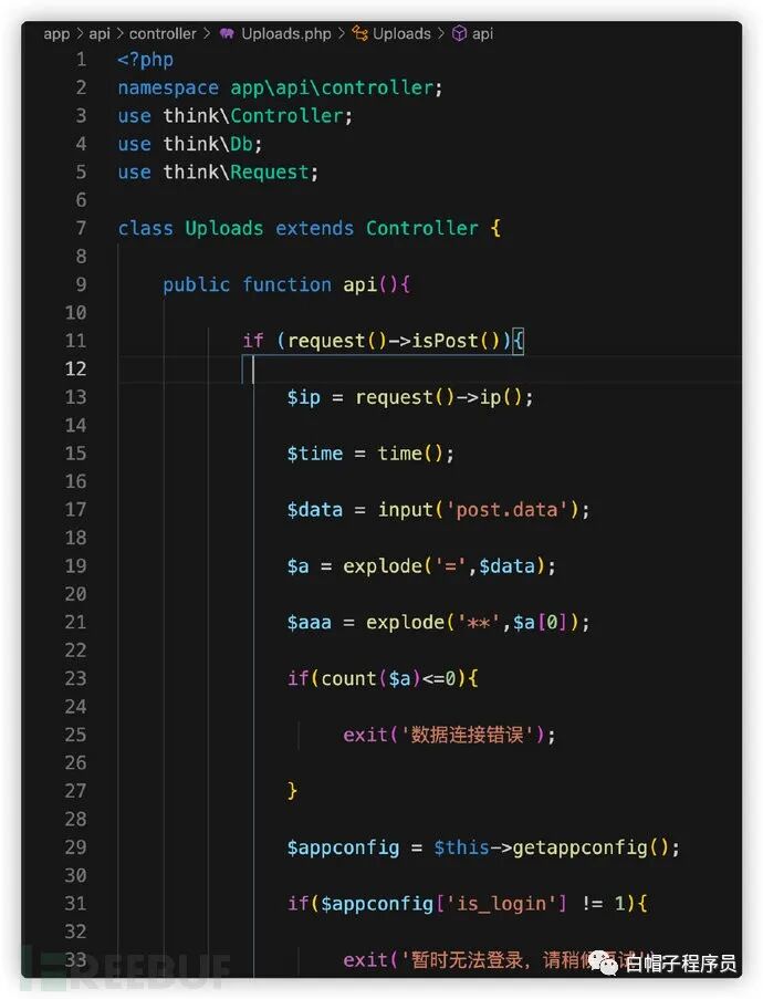 分析过前端代码时我们可以看到,后门APP通过后台API接口明文上传了受害者的隐私信息,这在后台的PHP代码中可以找到对应的代码逻辑部分。所有的关键功能都集中在app/api/controller/Uploads.php中:
