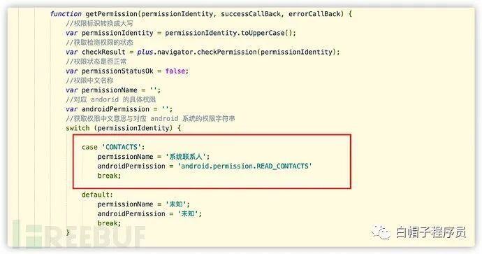 代码首先会通过方法getPermission()获取手机通讯录权限: