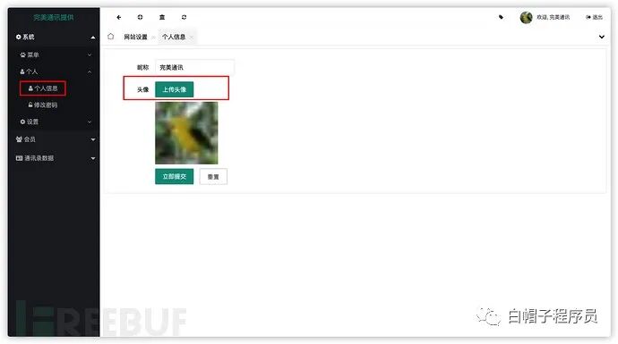 上传点在上传头像的地方,还是在系统中,在个人->个人信息,可以修改头像,通过此处随便传个phpinfo先。