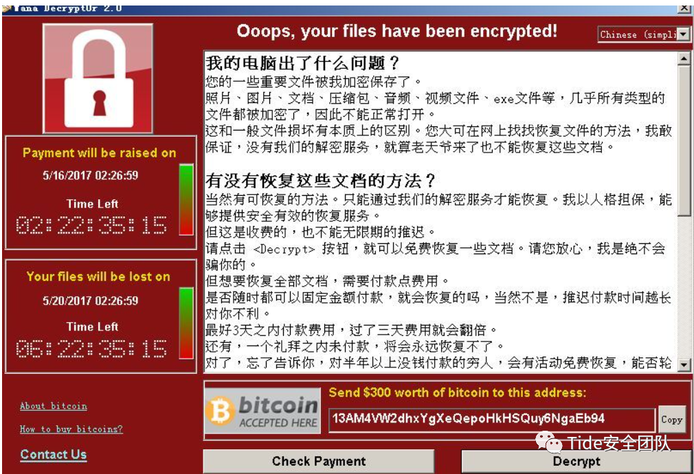 众所周知,受害者机器在感染勒索病毒后,一般情况下勒索病毒只需要加密文件的头部1024或2048个字节,因为文件格式,关键数据结构等都是写在头部,所以勒索病毒加密的速度通常会很快,主要加密包括 Word、Excel、PPT、文档、图片、压缩包、数据库、源码等等,通常会要求用户支付赎金才可以解密相关数据,如下图为wana cry的勒索界面,那勒索病毒常用的加密算法什么呢,为什么我们通常在无法支付赎金的情况下无法对数据进行解密呢,接下来进行依次探究。