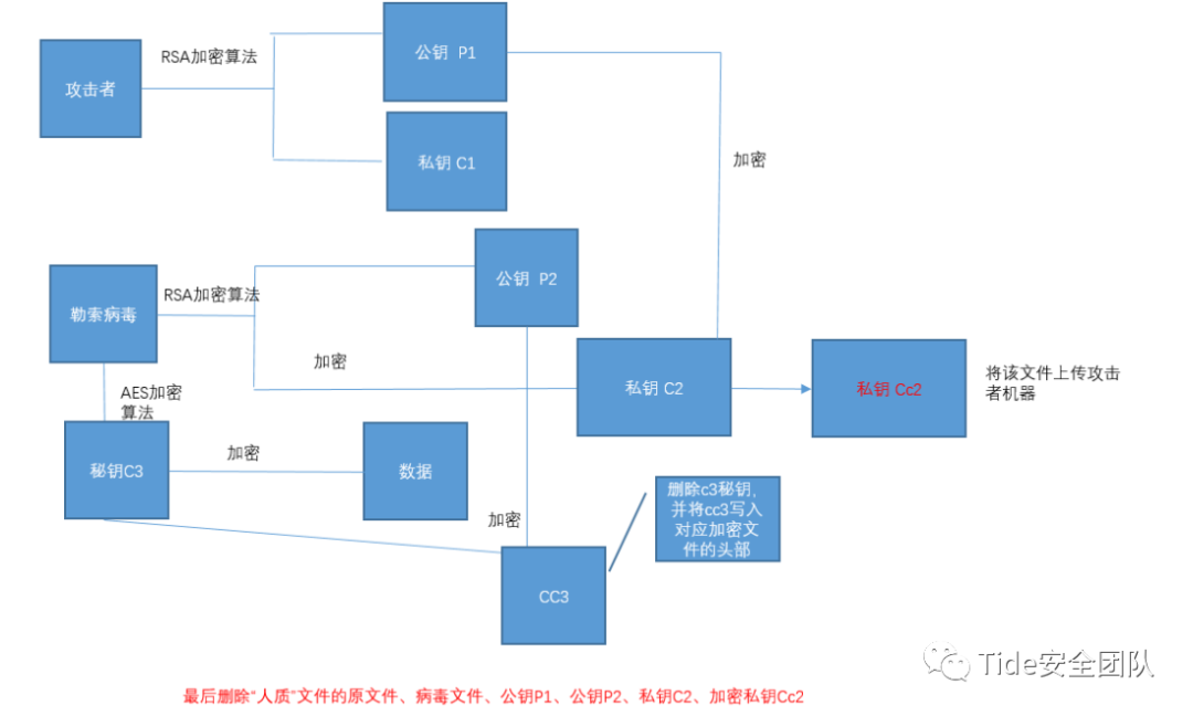 (5)勒索病毒使用公鑰P2对不同的私钥C3进行加密生成不同的加密私钥Cc3,并删除密钥C3。