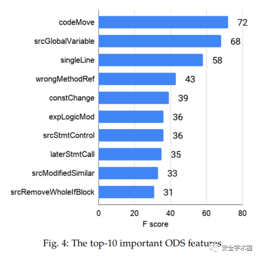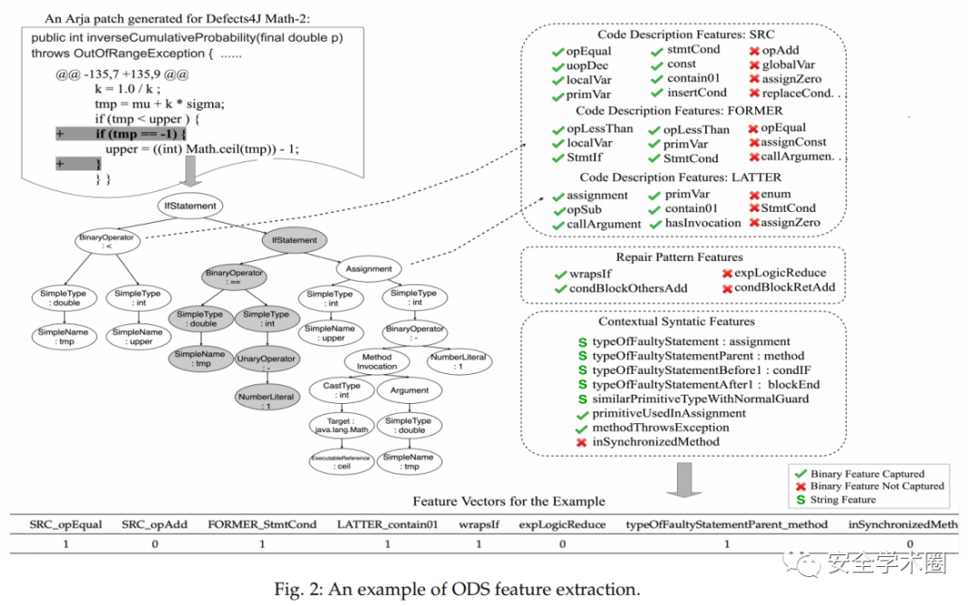 图2的用处来了!!! 图中灰色节点表示AST diff(也就是patch),ODS从被这些节点影响的节点上提取特征。对于这个补丁,提取的代码描述特征包括:opEqual(二元操作符“==”),uopDec(一元操作符“-”),localVar(局部变量temp),如图中绿钩表示。对于其他特征,如assingZero和opAdd,则没有被捕获,如图中红叉表示。同样的,ODS还从改变的AST的前后(图中的虚线箭头)提取代码描述特征。对于补丁模式特征,ODS只提取了两个,即wrapsIf和condaBlockOthersAdd。所有的特征都被转换成图2底部的向量表示(最后一列阶段了是不是,哈哈)。