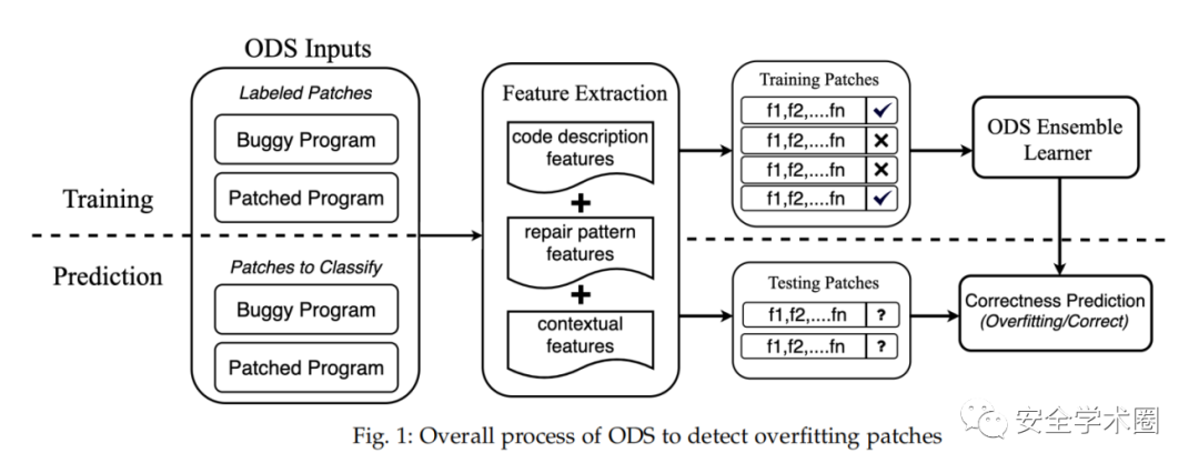 自动程序修复(Automated Program Repair,APR)旨在降低手动修复软件缺陷的成本。然而,APR生成可能会生成大量过度拟合补丁,这些补丁除了使测试通过之外,并不能正确地修复缺陷。过拟合补丁问题导致生成的程序修复补丁价值低,严重影响了程序修复在实践中的适用性。因此,本文提出了一个名为ODS的模型(缘分呀,这不就是上一篇阅读笔记提到的模型吗?众里寻他千百度),用于检测过拟合补丁。ODS基于这样的假设,即:可以跨程序修复系统和跨软件项目进行过拟合补丁检测,因为存在捕获用于分类过拟合补丁的通用正确性属性的代码特征。