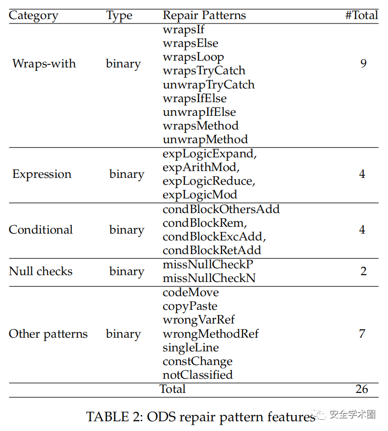 补丁模式特征: 为了帮助ODS学习补丁的语义信息,作者还引入了由人类专家提取的修复模式,也就是使用Sobreira等人[1]的修复模式分类法,基于对395个Defect4j人工编写的补丁的手动分析,它定义了修复模式和操作的列表。ODS集成了来自文章[2]的26种修复模式。表2给出了ODS考虑的26种修复模式。