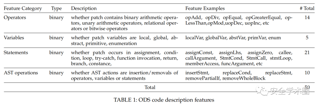 代码描述特征: 在表1中,作者给出了四类50个代码描述特征(这些特征都是二值特征):