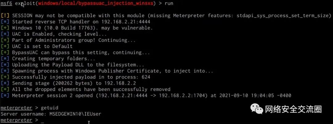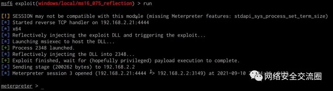 run6、如果成功,模块将把meterpreter阶段发送到目标,您应该会收到一个提升的meterpreter会话,如下面的屏幕截图所示。
