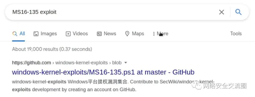 ./windows-exploit-suggester.py --database <DATABASE.XLSX> --systeminfo <SYSTEMINFO.TXT>5、我们始终建议使用Windows-Exploit-Suggester推荐的第一个漏洞。在本例中,我们将从MS16-135内核漏洞开始。我们将需要确定有关该漏洞的更多信息以及如何使用它。这可以通过执行快速Google搜索来完成,如以下屏幕截图所示: