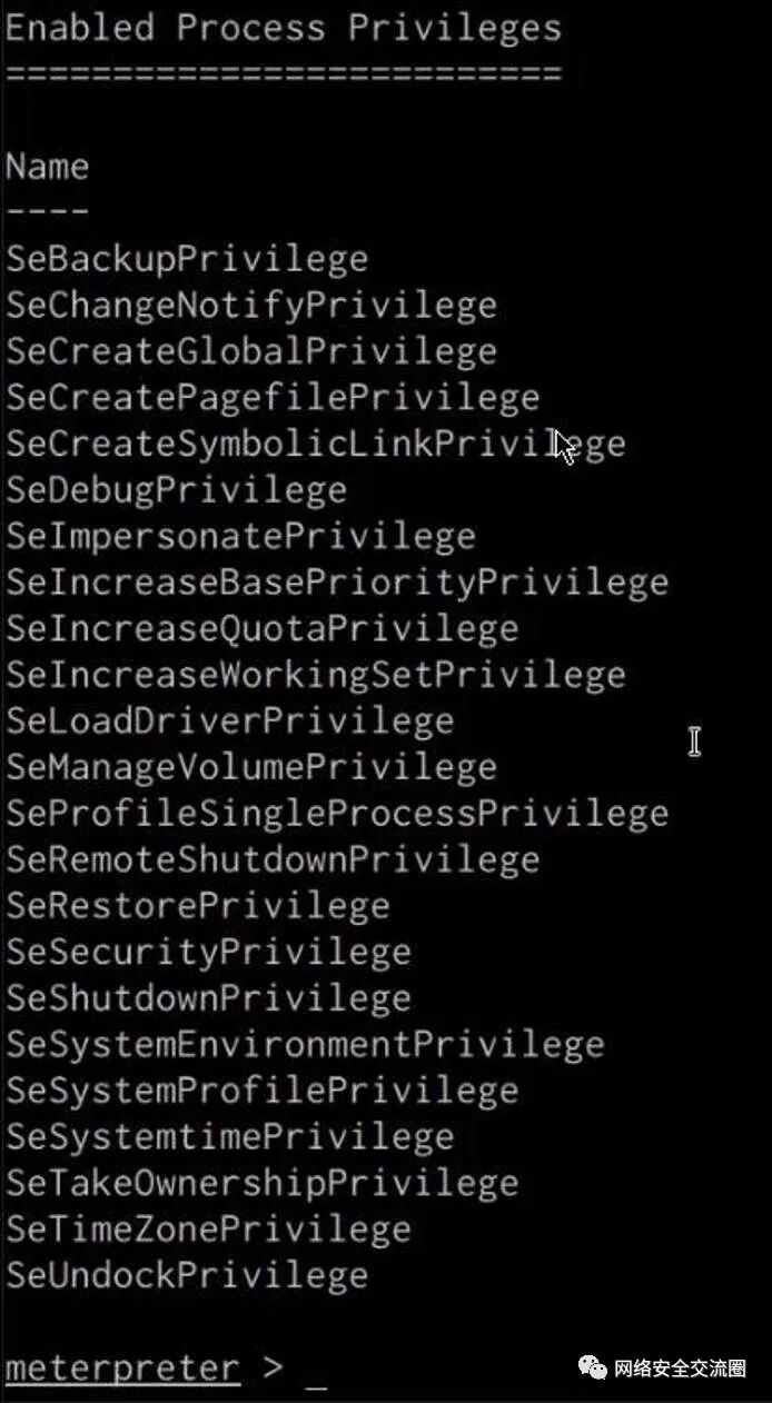 7、我们可以通过列出当前用户的Windows权限来确认我们有一个提升的会话,这可以通过在meterpreter中运行以下命令来完成: