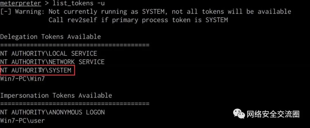 list_tokens -u如下面的屏幕截图所示,我们能够识别“NT AUTHORITY\SYSTEM”令牌。